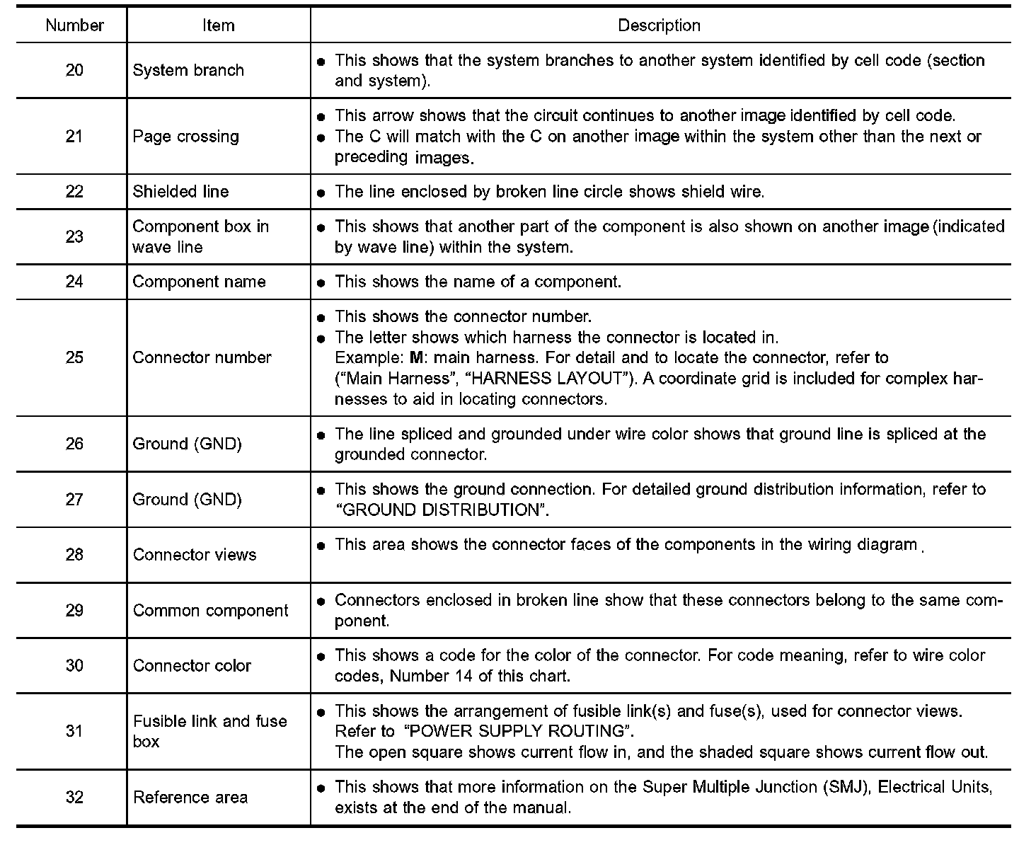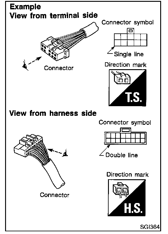 - Connector symbols shown from the harness side are enclosed by a double line and followed by the direction mark.
