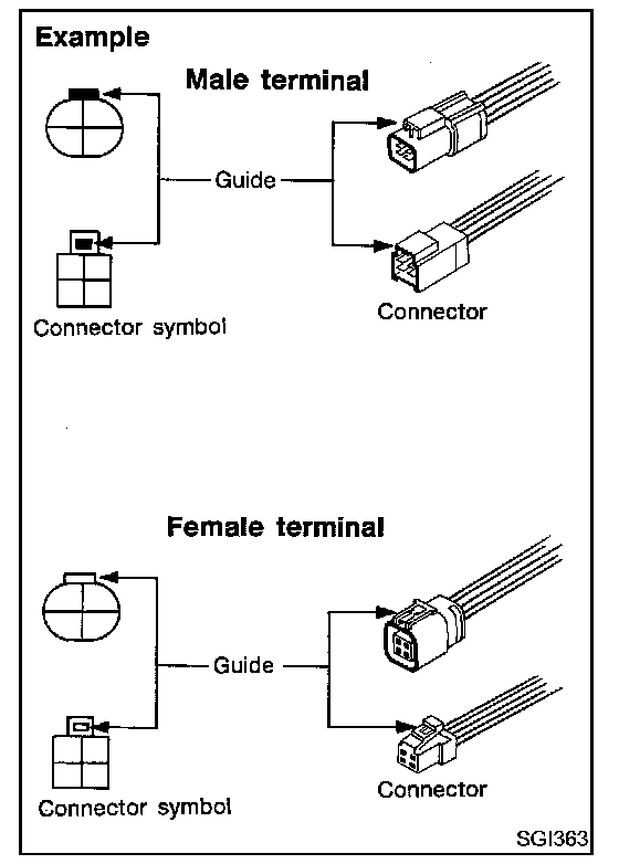 Connector guides for male terminals are shown in black and female terminals in white in wiring diagrams.