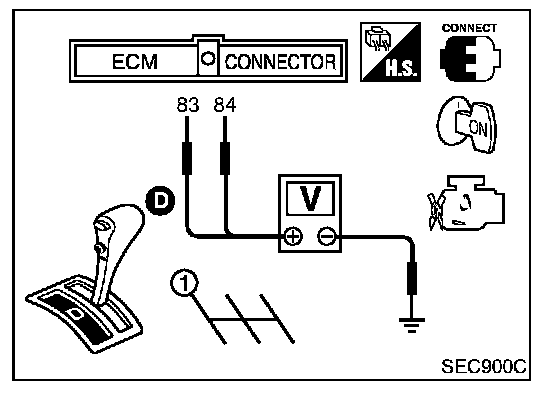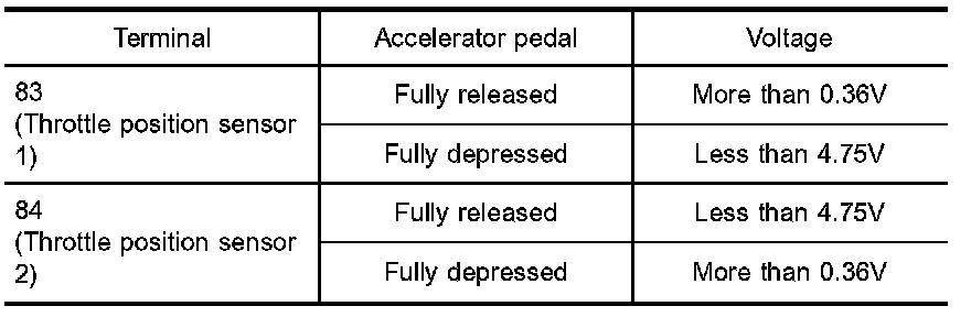 5. Check voltage between ECM terminals 83 (TP sensor 1), 84 (TP sensor 2) and engine ground under the following conditions.