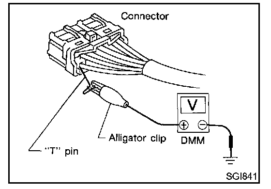 Connector damage and an intermittent connection can result from improperly probing of the connector during circuit checks. The probe of a digital multimeter (DMM) may not correctly fit the connector cavity. To correctly probe the connector follow the procedures using a "T" pin. For the best contact grasp the "q" pin using an alligator clip.
