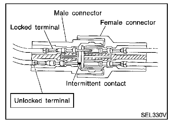 If the intermittent open circuit occurs follow the procedure to inspect for open wires and enlarged contact spring of female terminal.