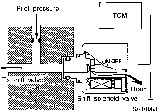 The shift solenoid valve performs simple ON-OFF operation. When set to ON, the drain circuit closes and pilot pressure is applied to the shift valve.