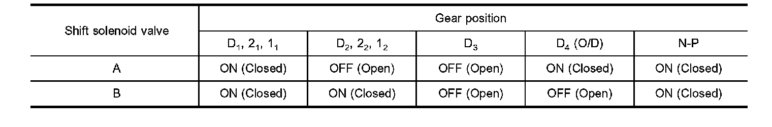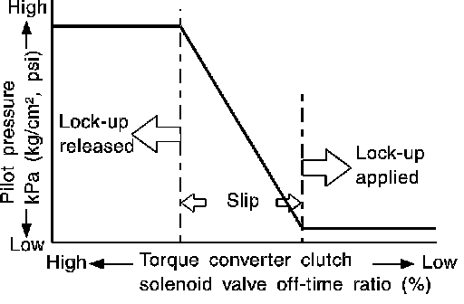 The torque converter clutch piston in the torque converter is locked to eliminate torque converter slip to increase power transmission efficiency. The solenoid valve is controlled by an ON-OFF duty signal sent from the TCM. The signal is converted to an oil pressure signal which controls the lock-up piston.