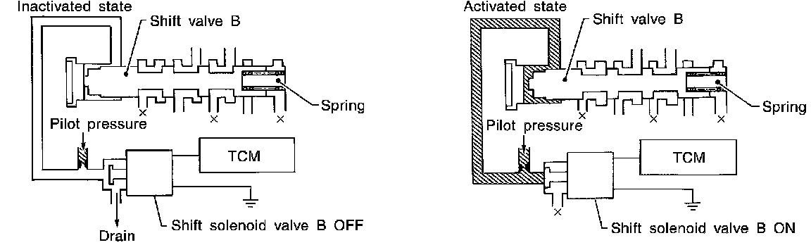 The drawing above shows the operation of shift valve B. When the shift solenoid valve is ON, pilot pressure applied to the end face of the shift valve overcomes spring force, moving the valve upward.