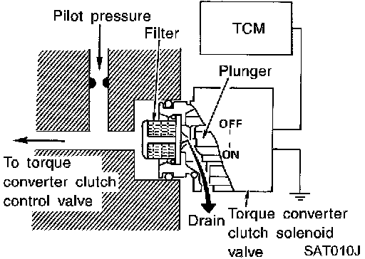 The torque converter clutch solenoid valve is controlled by the TCM. The plunger closes the drain circuit during the OFF period, and opens the circuit during the ON period. If the percentage of OFF-time increases in one cycle, the pilot pressure drain time is reduced and pilot pressure remains high.
