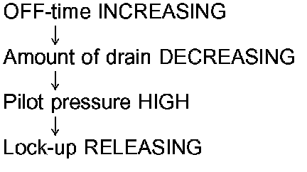 When the OFF-duration of the torque converter clutch solenoid valve is short, pilot pressure drains and becomes low. Accordingly, the control valve moves to the right by the pilot pressure of the other circuit and converter pressure. As a result, converter pressure is applied to chamber B. keeping the torque converter clutch piston applied.
