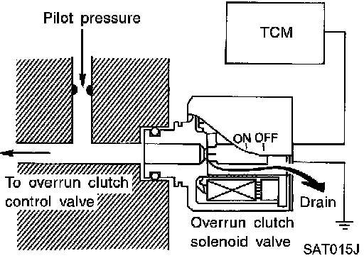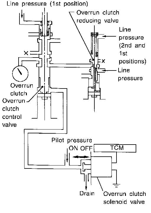 During the solenoid valve ON pilot pressure is applied to the end face of the overrun clutch control valve.