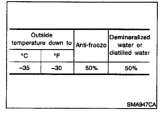 CAUTION: When adding or replacing coolant, be sure to use only Genuine Nissan anti-freeze coolant or equivalent with the proper mixture ratio of 50% anti-freeze and 50% demineralized water/distilled water.