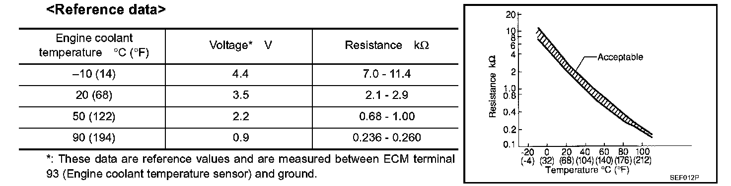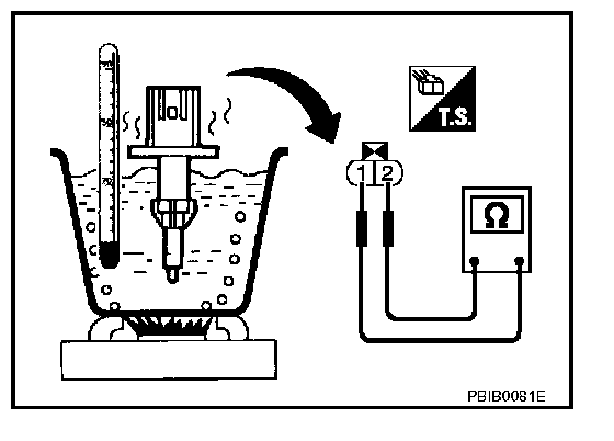 1. Check resistance between engine coolant temperature sensor terminals 1 and 2 as shown in the figure.