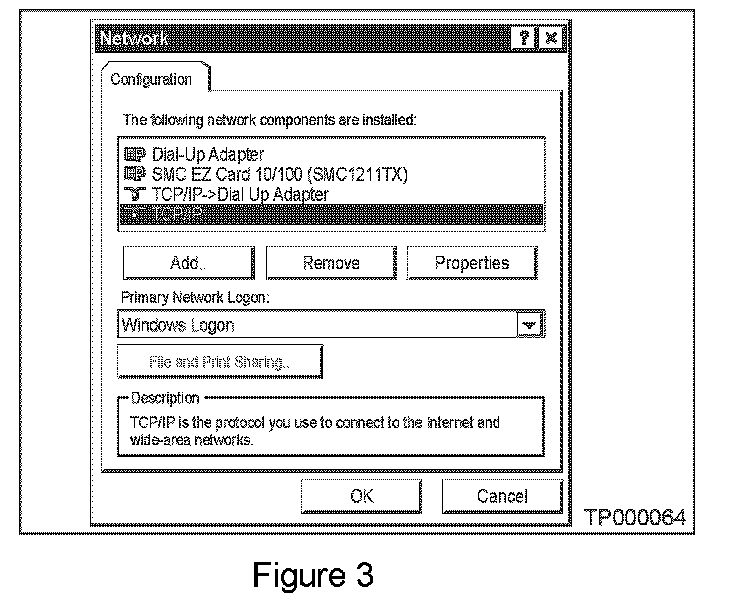 B. When the "Network Configuration" screen appears (see Figure 3) select "TCP/IP". Then select "PROPERTIES".