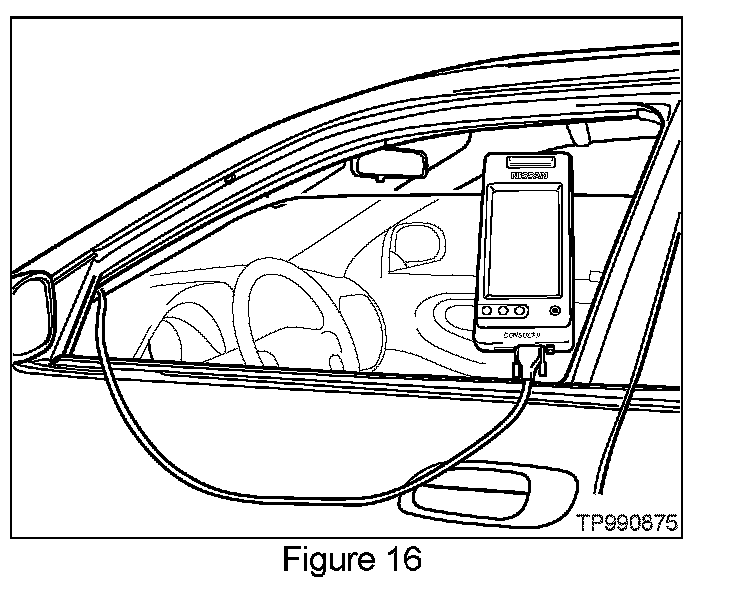16. Roll down the driver's window part way, exit the vehicle, close the door, and hang the CONSULT II unit on the outside of the window (see Figure 16).