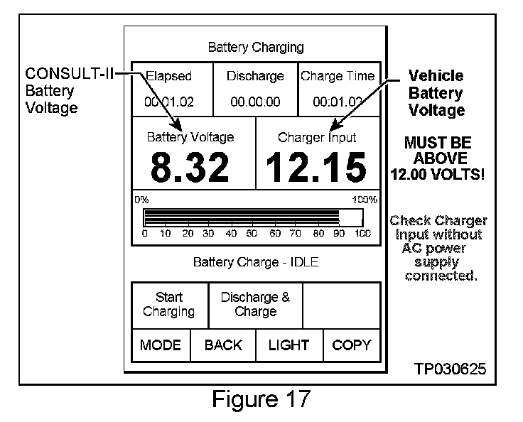 18. Check the CONSULT-II's "Charger Input" reading (see Figure 17).