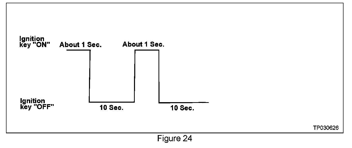30. Wait more than 10 seconds, then turn the ignition switch "ON" for 1 second. Then, turn the ignition switch "OFF" again for 10 seconds (see Figure 24).