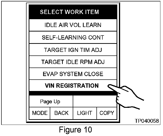 C. Scroll down and select [VIN REGISTRATION] on the "Select Work Item" screen. See Figure 10.