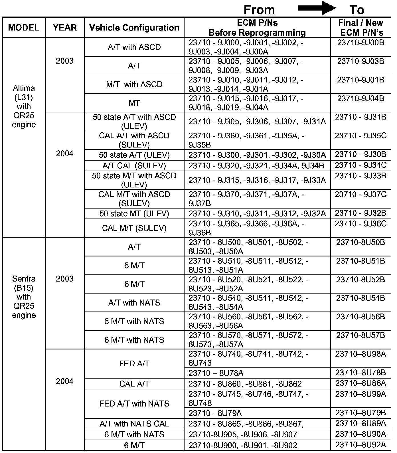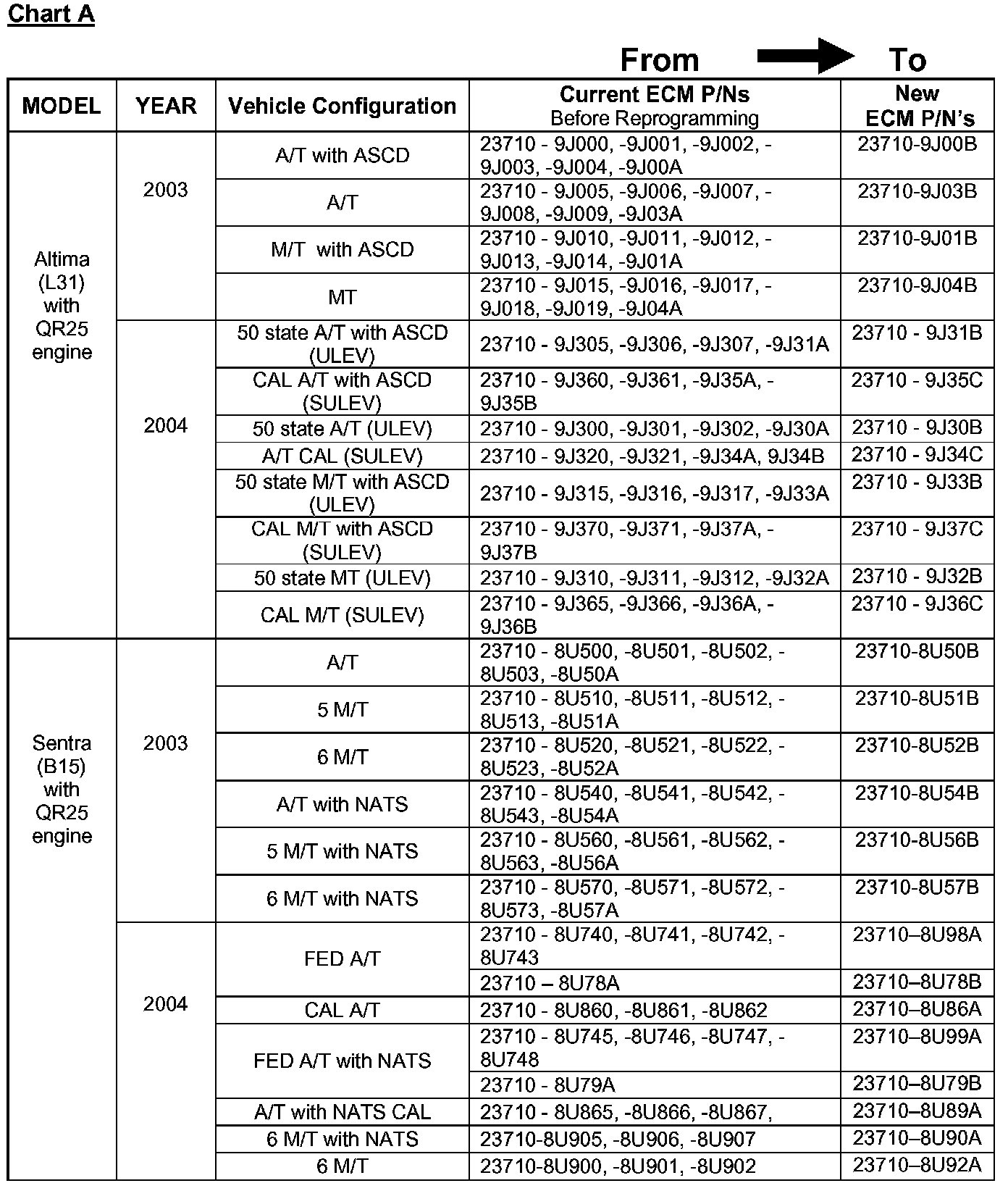 ^ Compare your vehicle's ECM P/N to those shown under Current ECM P/N in Chart A, shown.