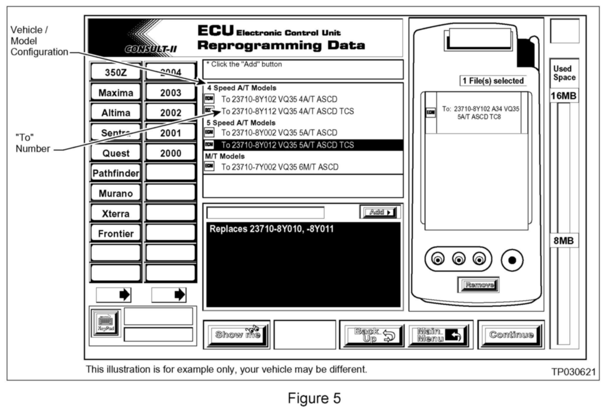 ^ Do not unplug CONSULT-II from the vehicle during reprogramming. Permanent ECM damage can occur.