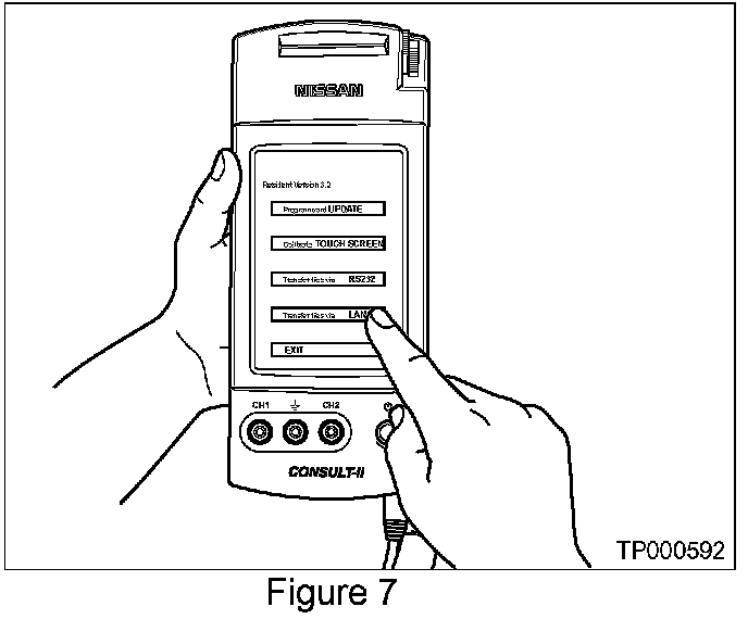 If you accidentally choose a menu option other than "Transfer Files via LAN"; turn CONSULT-II "OFF", and then back "ON" as shown in Figure 6 above.