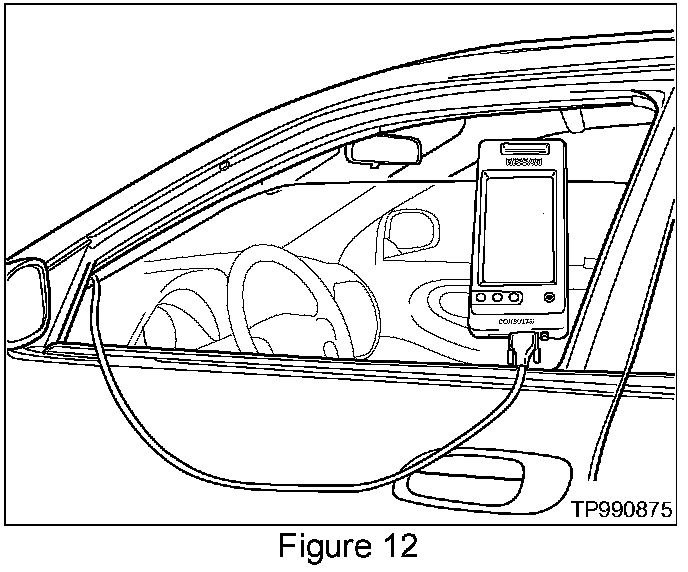 16. Roll down the driver's window part way, exit the vehicle, close the door, and hang the CONSULT II unit on the outside of the window (see Figure 12).
