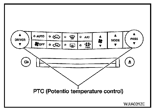 The PTC is built into the A/C and AV switch. It can be set at an interval of 0.5 °C (1.0 °F) in the 18 °C (60 °F) to 32 °C (90 °F) temperature range by pressing the temperature switch. The set temperature is displayed.