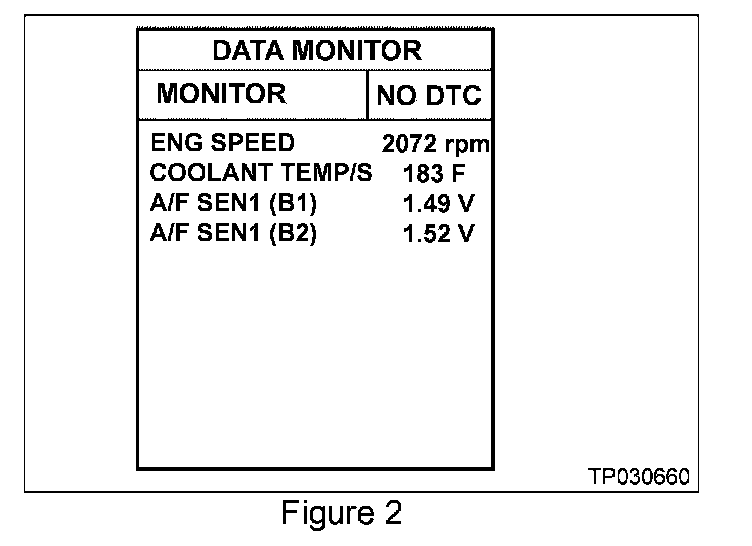 4. Use CONSULT-II DATA MONITOR to view; Engine Speed and A/F Sensor voltage (see Figure 2).