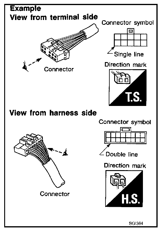 - Connector symbols shown from the harness side are enclosed by a double line and followed by the direction mark.