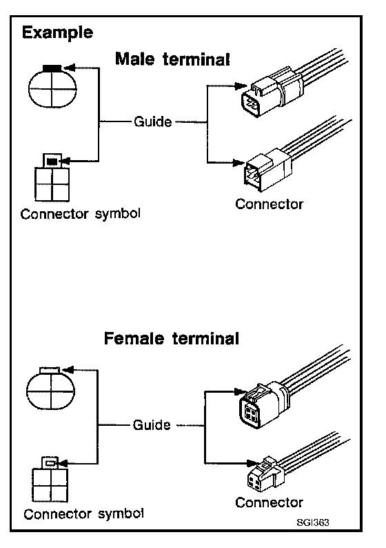 Connector guides for male terminals are shown in black and female terminals in white in wiring diagrams.