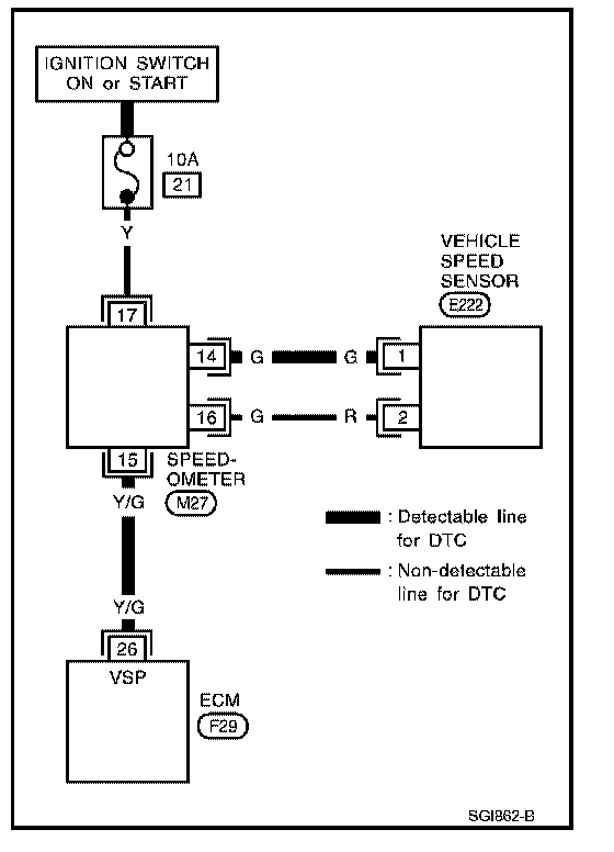 - A line with regular weight (wider line) represents a "detectable line for DTC (Diagnostic Trouble Code)". A "detectable line for DTC" is a circuit in which ECM can detect its malfunctions with the on board diagnostic system.