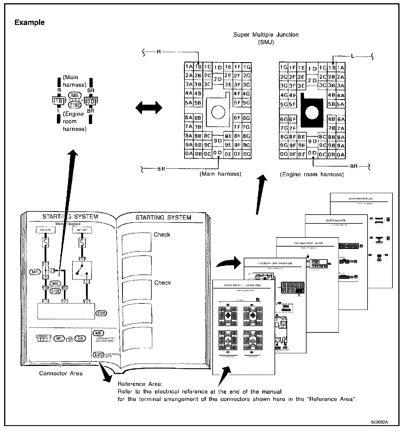 The Reference Area of the wiring diagram contains references to additional electrical reference at the end of the manual. If connector numbers and titles are shown in the Reference Area of the wiring diagram, these connector symbols are not shown in the Connector Area.