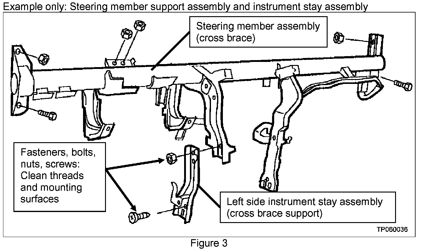 a. Remove the fasteners (nuts, bolts, screws) that attach the left side instrument stay assembly (cross brace support) to the steering member assembly (see Figure 3).