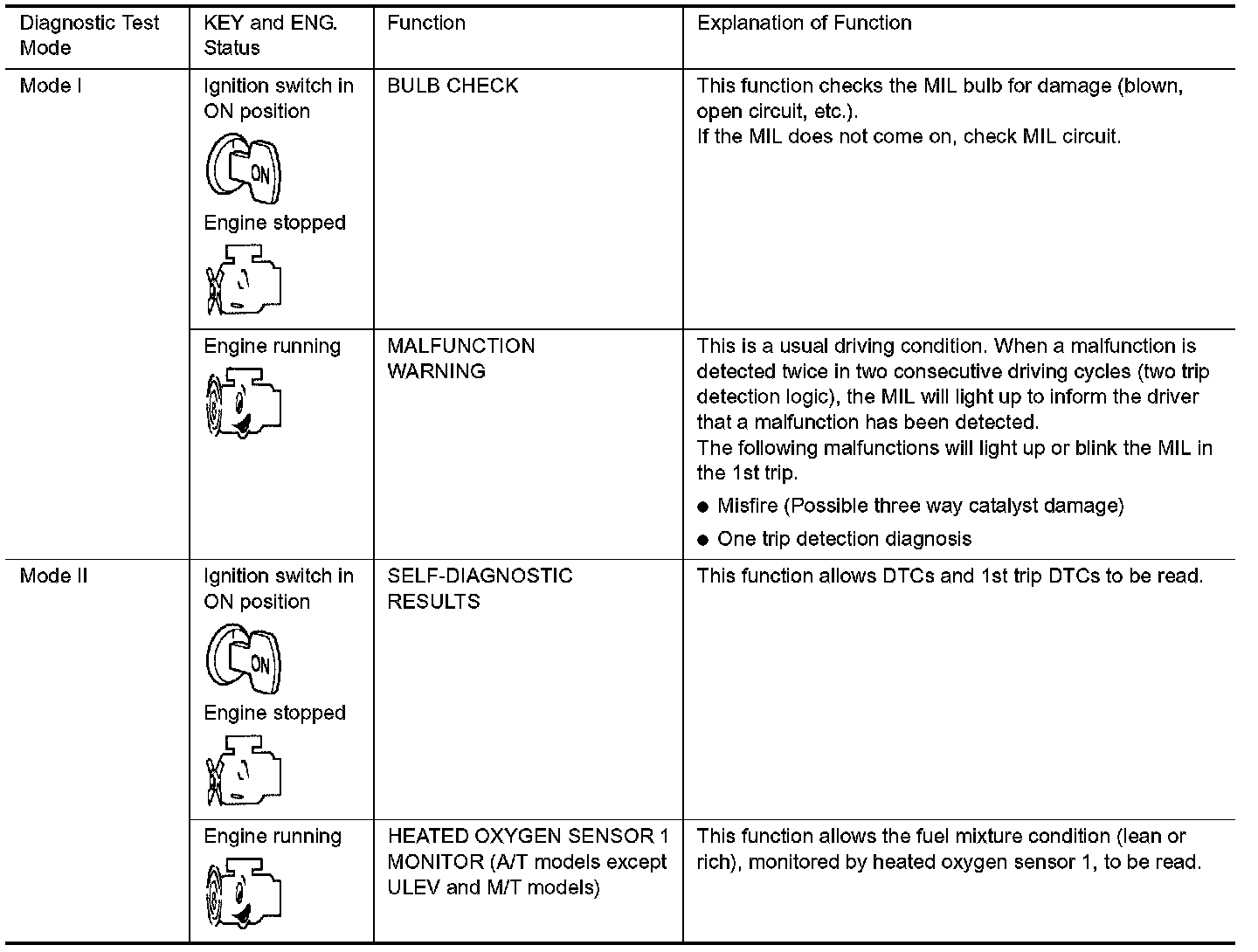 - Always ECM returns to Diagnostic Test Mode I after ignition switch is turned OFF.
