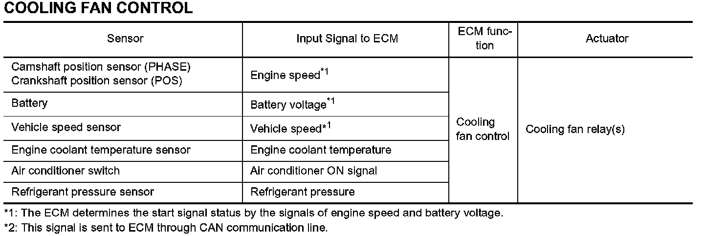 The ECM controls the cooling fan corresponding to the vehicle speed, engine coolant temperature, refrigerant pressure, and air conditioner ON signal. The control system has 3-step control [HIGH/LOW/OFF].