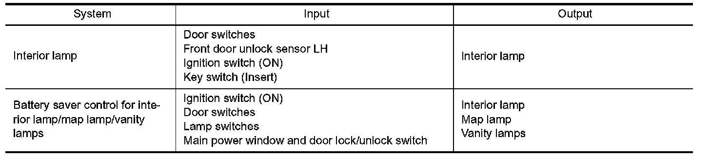 The lamps turn off automatically when the interior lamp, map lamp or/and vanity lamps are illuminated with the ignition key in the OFF position, if the lamp remains lit by the door switch open signal or if the lamp switch is in the ON position for approximately 10 minutes.