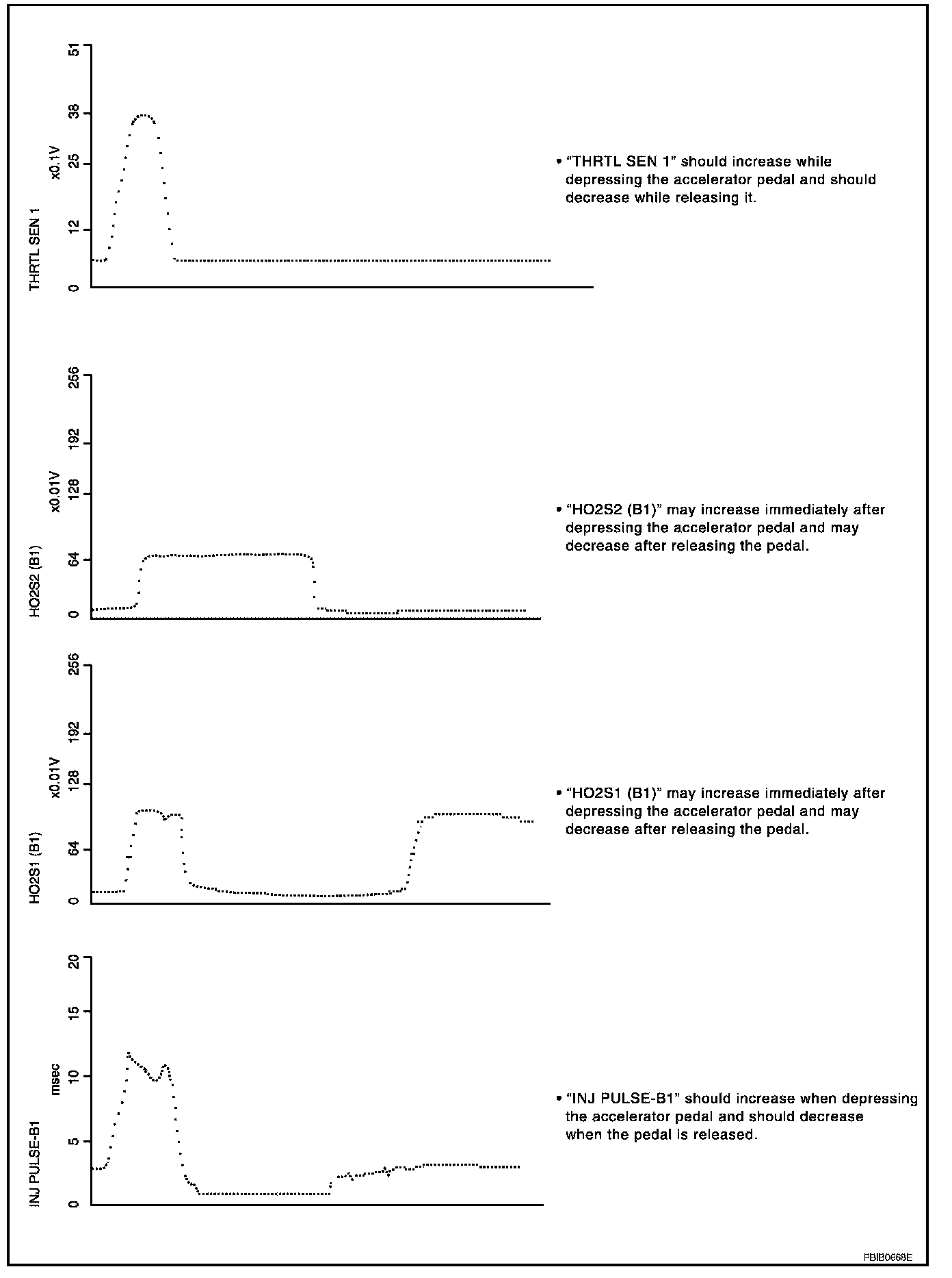 ENG SPEED, MAS A/F SE-B1, THRTL SEN 1, HO2S2 (B1), INJ PULSE-B1(A/T MODELS EXCEPT ULEV)