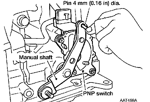 4. Insert pin into adjustment holes in both park/neutral position (PNP) switch and manual shaft as near vertical as possible.