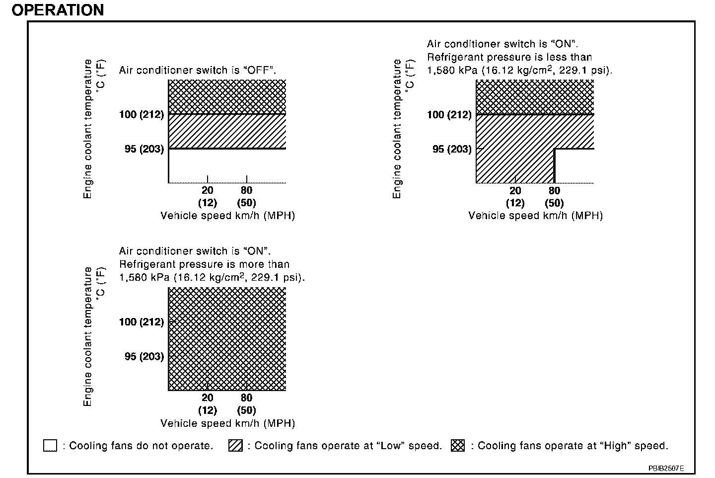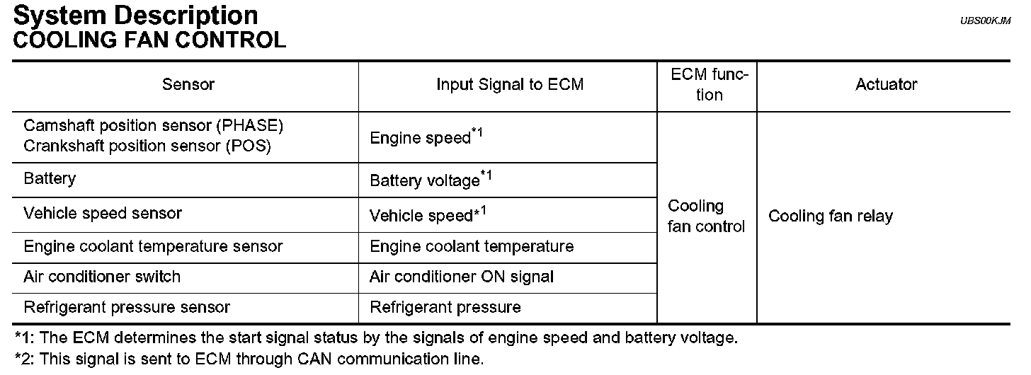 The ECM controls the cooling fan corresponding to the vehicle speed, engine coolant temperature, refrigerant pressure, and air conditioner ON signal. The control system has 3-step control [HIGH/LOW/OFF].