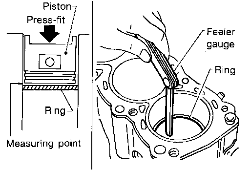 ^ If out of specification, replace piston ring. If gap still exceeds the limit even with a new ring, re-bore cylinder and use oversized piston and piston ring.