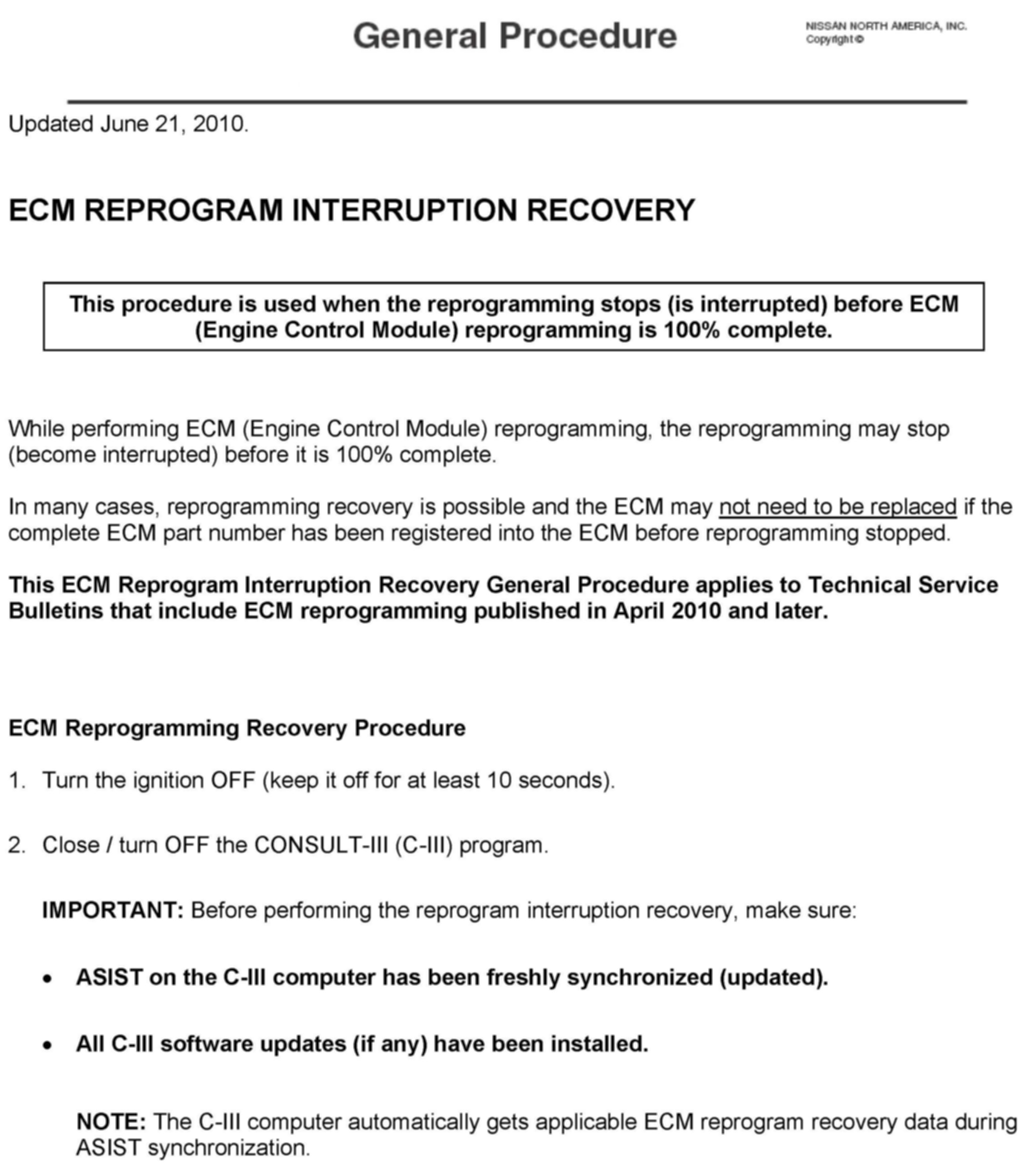 A complete step-by-step General Procedure for CONSULT-III (C-III) ECM Reprogram Interruption Recovery is now available by attachment in this bulletin.
