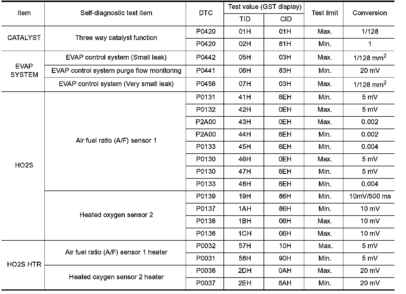 The test value is a parameter used to determine whether a system/circuit diagnostic test is OK or NG while being monitored by the ECM during self-diagnosis. The test limit is a reference value which is specified as the maximum or minimum value and is compared with the test value being monitored.