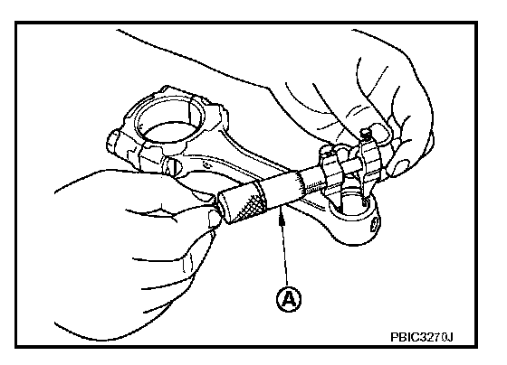 Measure the inner diameter of connecting rod bushing with an inside micrometer (A).