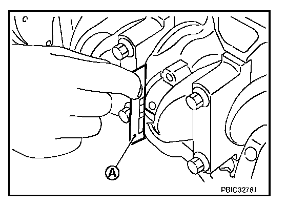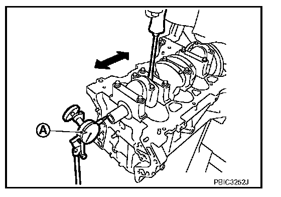CRANKSHAFT END PLAY^ Measure the clearance between thrust bearings and crankshaft arm when crankshaft is moved fully forward or backward with a dial indicator (A).