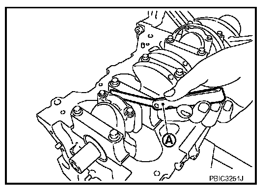 ^ Remove main bearing cap and bearings, and using the scale (A) on the plastigage bag, measure the plastigage width.