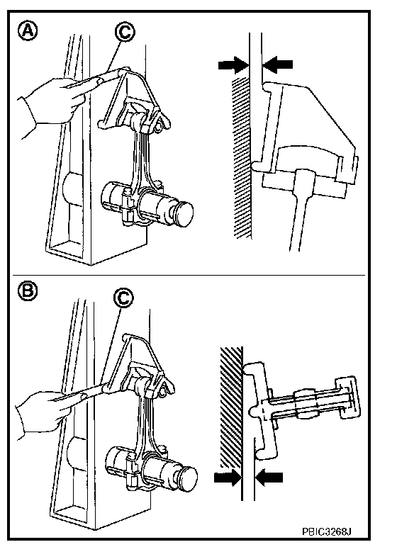 ^ Using a bore gauge (A), measure the cylinder bore for wear, out-of-round and taper at six different points on each cylinder. ("X" and "Y" directions at "A", "B" and "C") ("Y" is in longitudinal direction of engine)