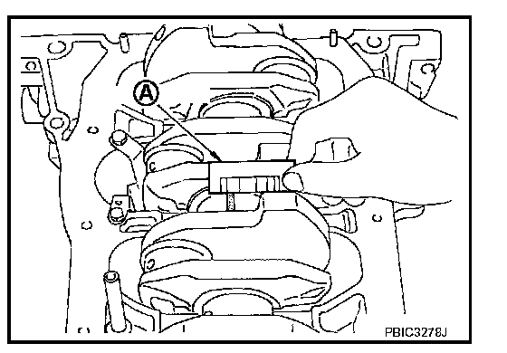 ^ Install main bearing cap without main bearings installed, and tighten main bearing cap bolts to the specified torque.