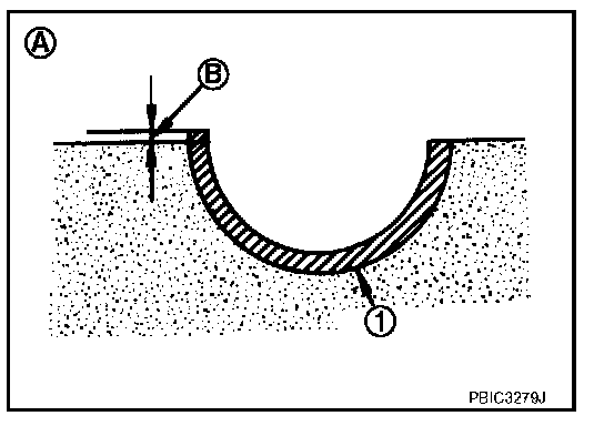 ^ When main bearing cap is removed after being tightened to the specified torque with main bearings (1) installed, the tip end of bearing must protrude (B).