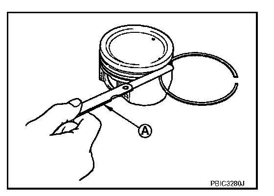 ^ Measure the side clearance of piston ring and piston ring groove with a feeler gauge (A).