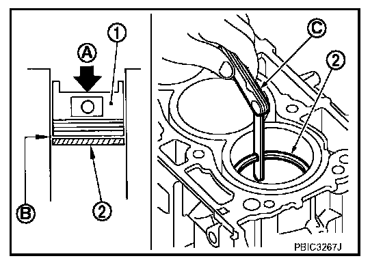 ^ Lubricate with new engine oil to piston (1) and piston ring (2), and then insert (A) piston ring until middle of cylinder (B) with piston, and measure piston ring end gap with a feeler gauge (C).