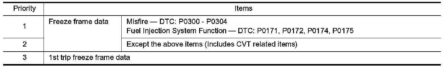 For example, the EGR malfunction (Priority: 2) was detected and the freeze frame data was stored in the 2nd trip. After that when the misfire (Priority: 1) is detected in another trip, the freeze frame data will be updated from the EGR malfunction to the misfire. The 1st trip freeze frame data is updated each time a different malfunction is detected. There is no priority for 1st trip freeze frame data. However, once freeze frame data is stored in the ECM memory, 1st trip freeze data is no longer stored (because only one freeze frame data or 1st trip freeze frame data can be stored in the ECM). If freeze frame data is stored in the ECM memory and freeze frame data with the same priority occurs later, the first (original) freeze frame data remains unchanged in the ECM memory.