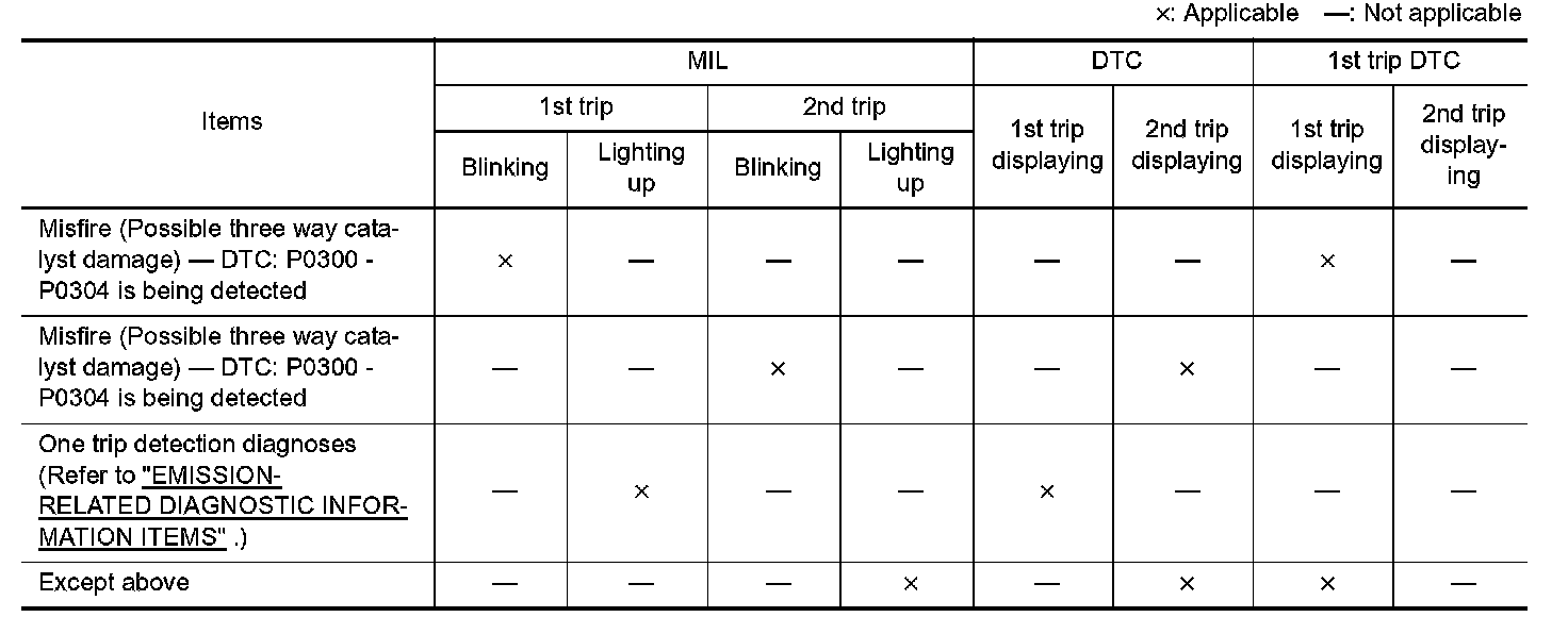 If the same malfunction is detected again during the next drive, the DTC and Freeze Frame data are stored in the ECM memory, and the MIL lights up. The MIL lights up at the same time when the DTC is stored. <2nd trip> The "trip" in the "Two Trip Detection Logic" means a driving mode in which self-diagnosis is performed during vehicle operation. Specific on board diagnostic items will cause the ECM to light up or blink the MIL, and store DTC and Freeze Frame data, even in the 1st trip, as shown.