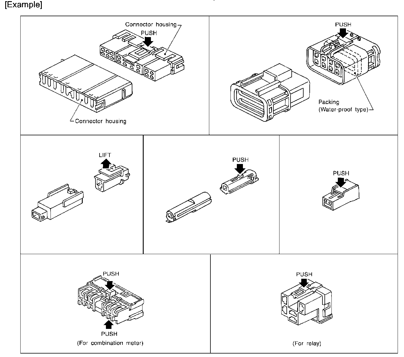 - The tab-locking type connectors are disconnected by pushing or lifting the locking tab(s). Refer to the illustration.