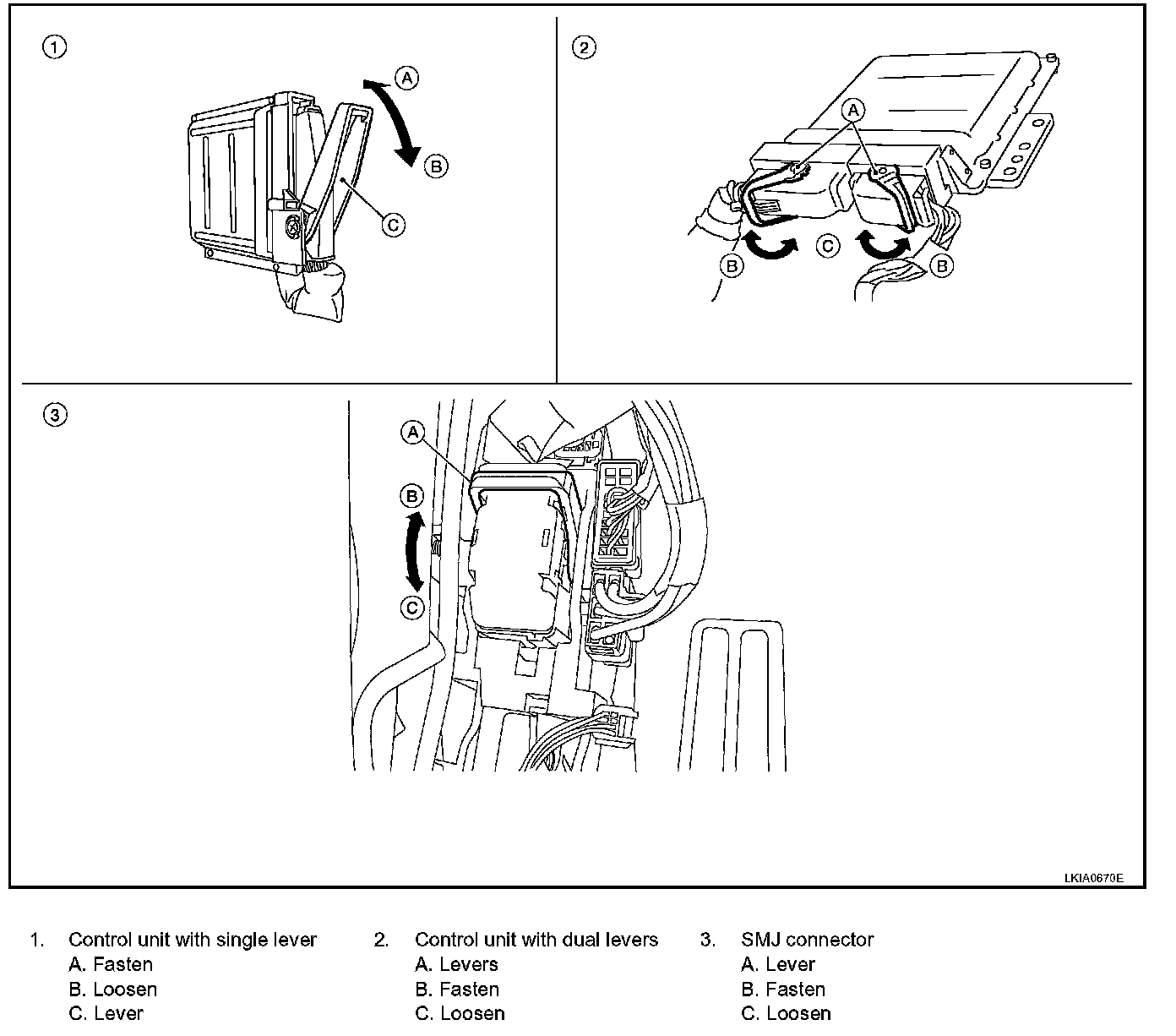 - Lever locking type harness connectors are used on certain control units and control modules such as ECM, ABS actuator and electric unit (control unit), etc.